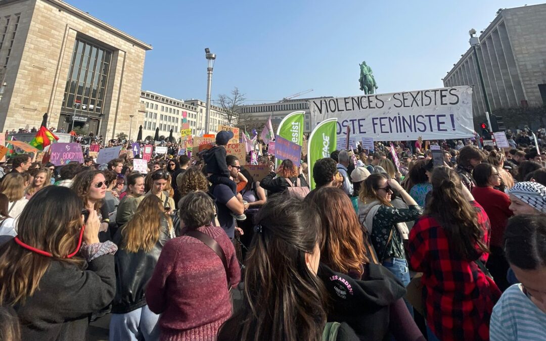 Le mois de mars a particulièrement été chargé en revendications citoyennes et politiques. Le 8 mars tout d’abord, journée de lutte pour les droits des femmes* où notre association était présente aux manifestations à Liège et Bruxelles. Bien que politiquement chargé, force est de constater qu’il était bon de se retrouver entre féministes sous ce beau soleil dominical. Laissant planer un air de légèreté dans ces rassemblements visibilisant pourtant toutes les violences subies par les minorités de genre et leurs droits fragilisés.